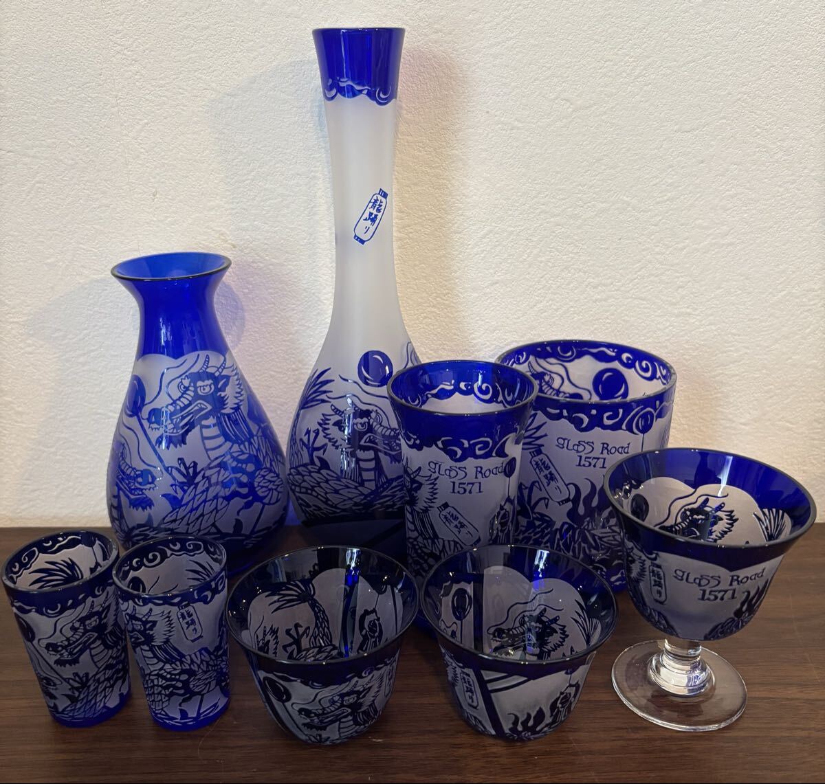 - グラスロード1571 龍踊り酒器9点セット 青 未使用品 徳利 お猪口 おちょこ グラス 日本酒