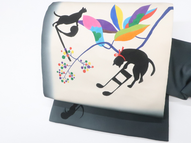 - 《古美術京松》リサイクル着物 オリジナル 塩瀬 九寸名古屋帯 暈し お太鼓柄 猫 音符 ネコ 正絹 sok7b09-41
