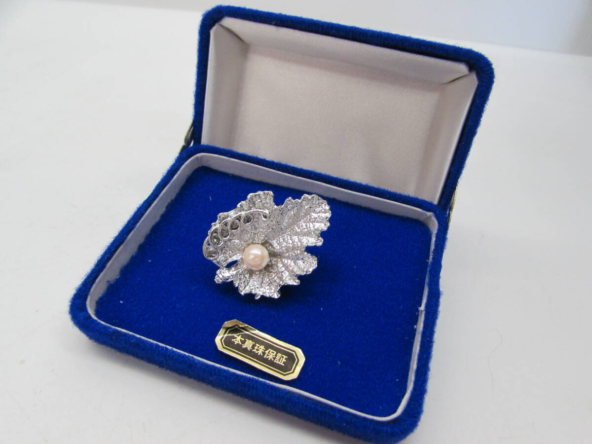 - 昭和レトロ 本真珠 ブローチ パール 葉っぱ 植物 シルバーカラー金具 ケース付き