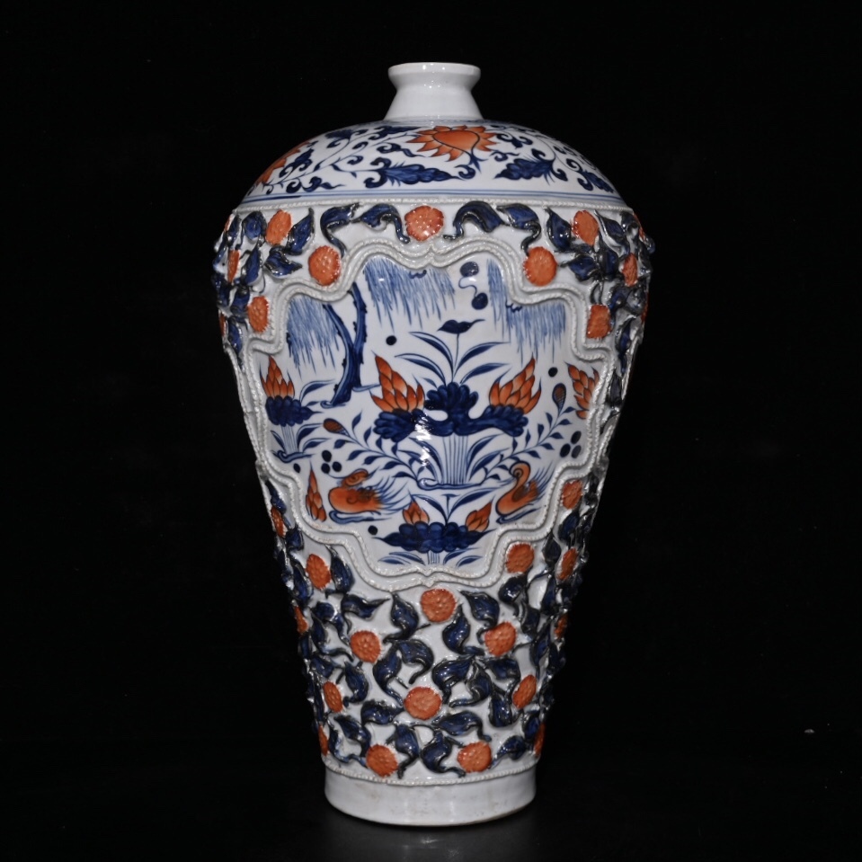 - 「元代風 幕府金蓮川款 古陶磁器 染付 梅瓶 青花 釉裡紅 捏花 麒麟紋 陶芸 瓷器」時代物 骨董 旧家蔵出し 唐物 中国古玩 華夏品 古美術品