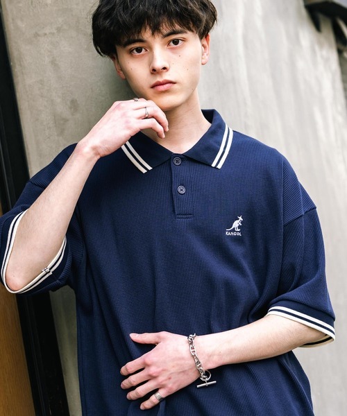 - 新品♪KANGOL≪カンゴール≫ ♪コラボ オーバーサイズワッフルダブルラインワンポイントロゴ刺繍半袖ポロシャツ メンズ♪♪Lサイズ♪