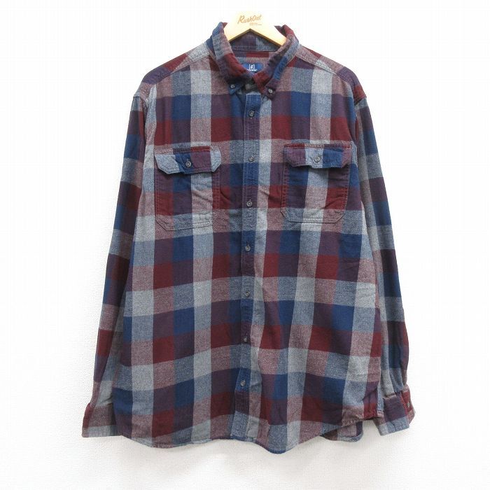 - XL/古着 長袖 フランネル シャツ メンズ 大きいサイズ ロング丈 コットン ボタンダウン 紺他 ネイビー チェック 24nov21 中
