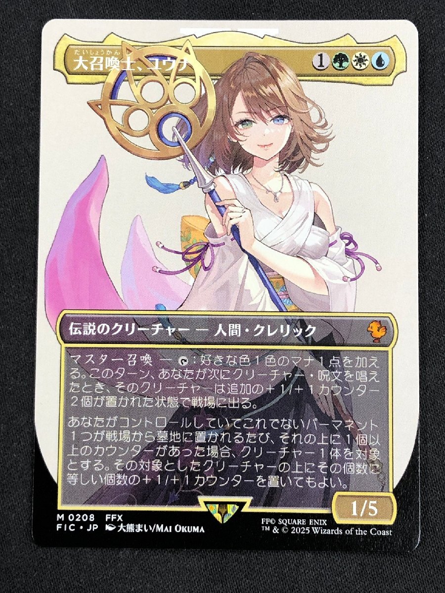 ●カード名:大召喚士、ユウナ/Yuna, Grand Summonerマスター召喚 ― T:好きな色1色のマナ1点を加える。このターン、あなたが次にクリーチャー・呪文を唱えたとき、そのクリーチャーは追加の+1/+1カウンター2個が置かれた状態で戦場に出る。