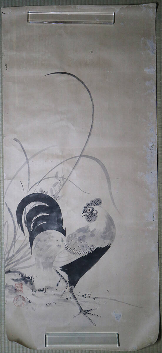 - J4/6)「模写」伊藤若冲 紙本 屏風の捲り「蘭に鶏図」墨絵 墨書 江戸時代 水墨画