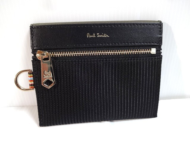 - 新品未使用 正規品 ポールスミス Paul Smith トラベルストライプポケット ファスナー小銭入れ 付 財布 ナイロン 革 カーキ PSN832