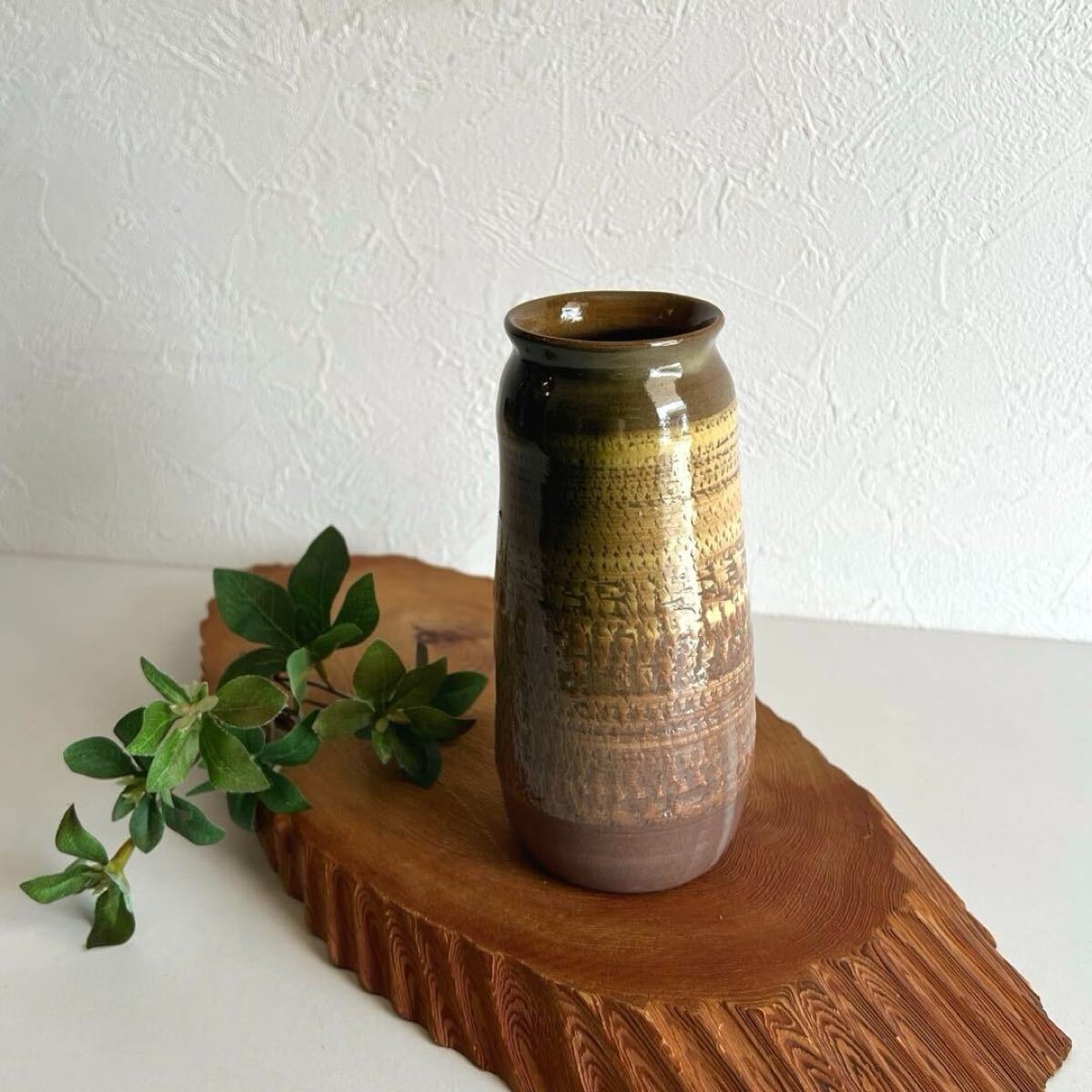 - wasabi k885 和陶器 フラワーベース/花瓶 くさび文字のような模様 ブラウン系 グリーンから乳白色へグラデーションがかった逸品
