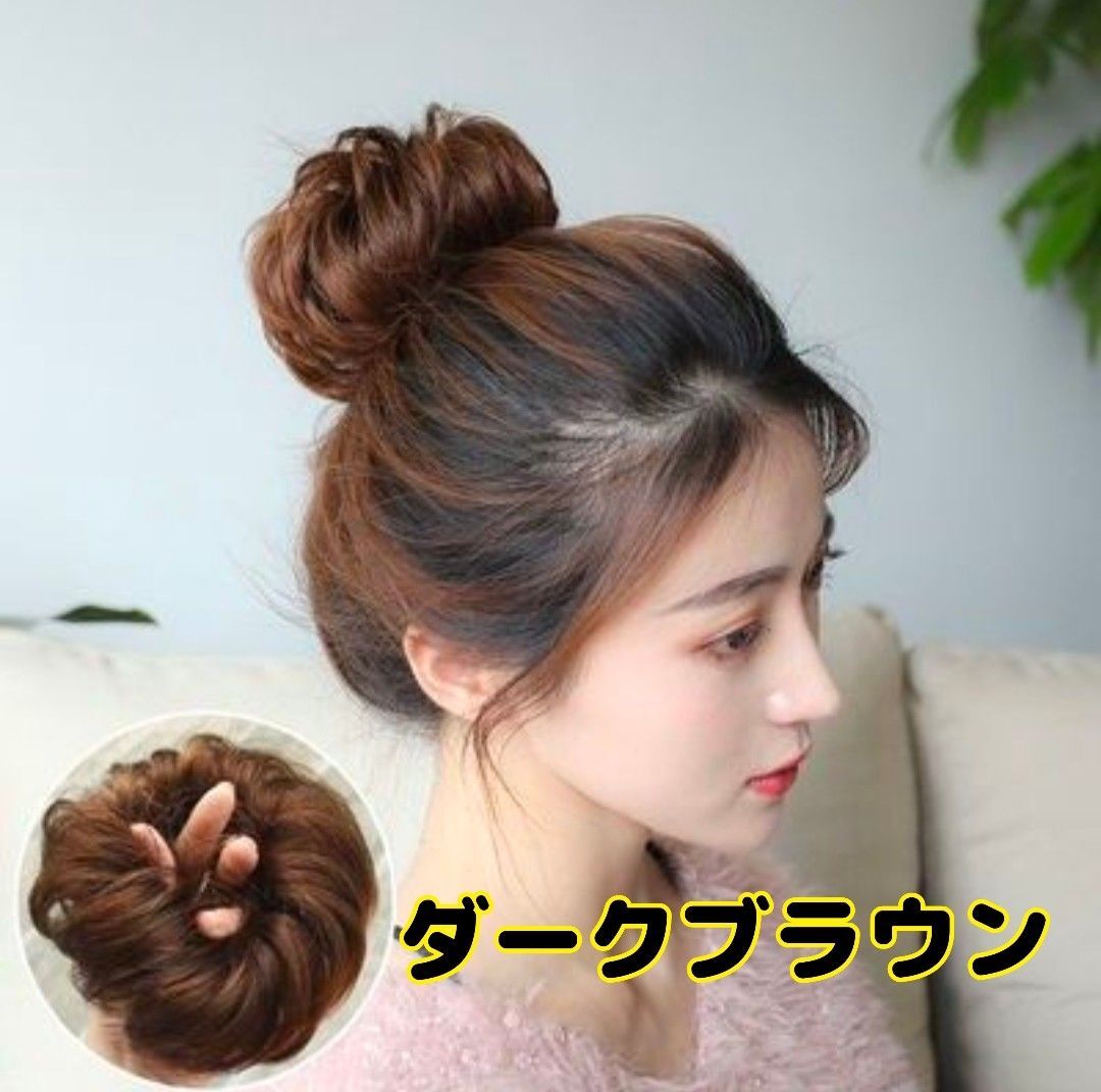 - お団子ウィッグ シュシュタイプ 簡単装着 自然なカール まとめ髪エクステ ダークブラウン