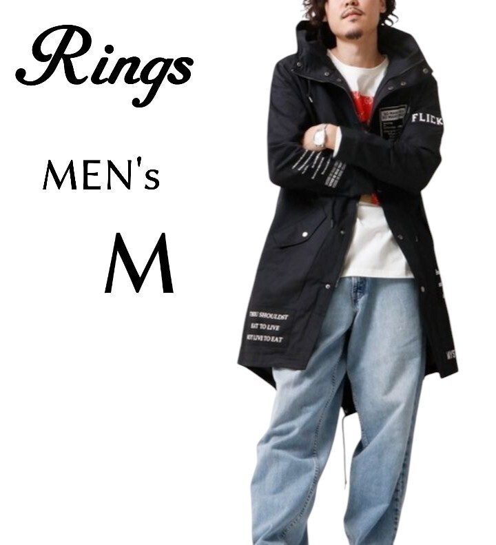 > 送料込み メンズMサイズ RINGS ワッペン多数モッズコート 黒色