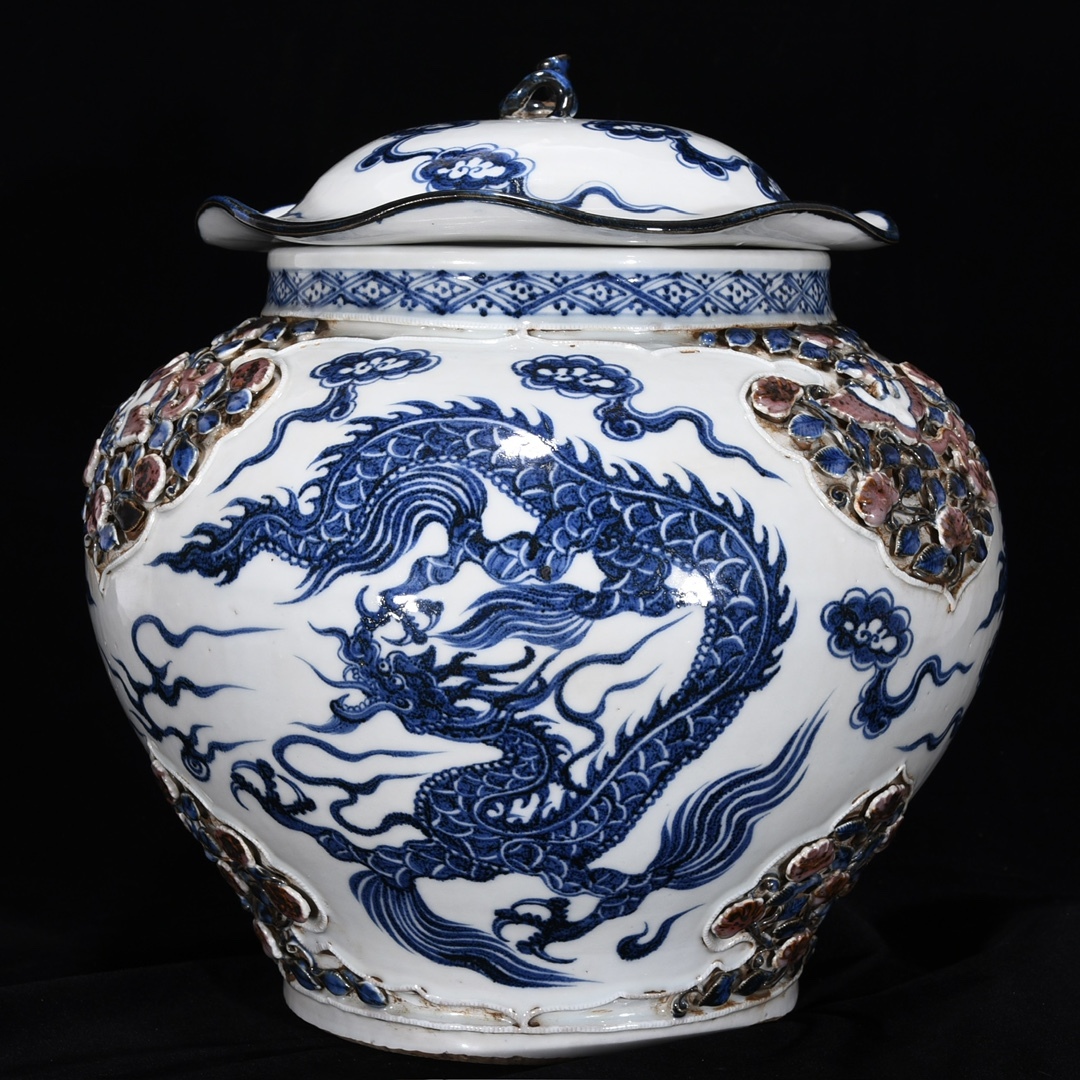 - 秘蔵 元時代 青花釉里紅竜紋捏花荷葉蓋罐・甕 34cm古陶磁器 陶芸 唐物 古賞物 時代物 骨董品 古置物 極細工 中国磁器 古美味 中国古玩921