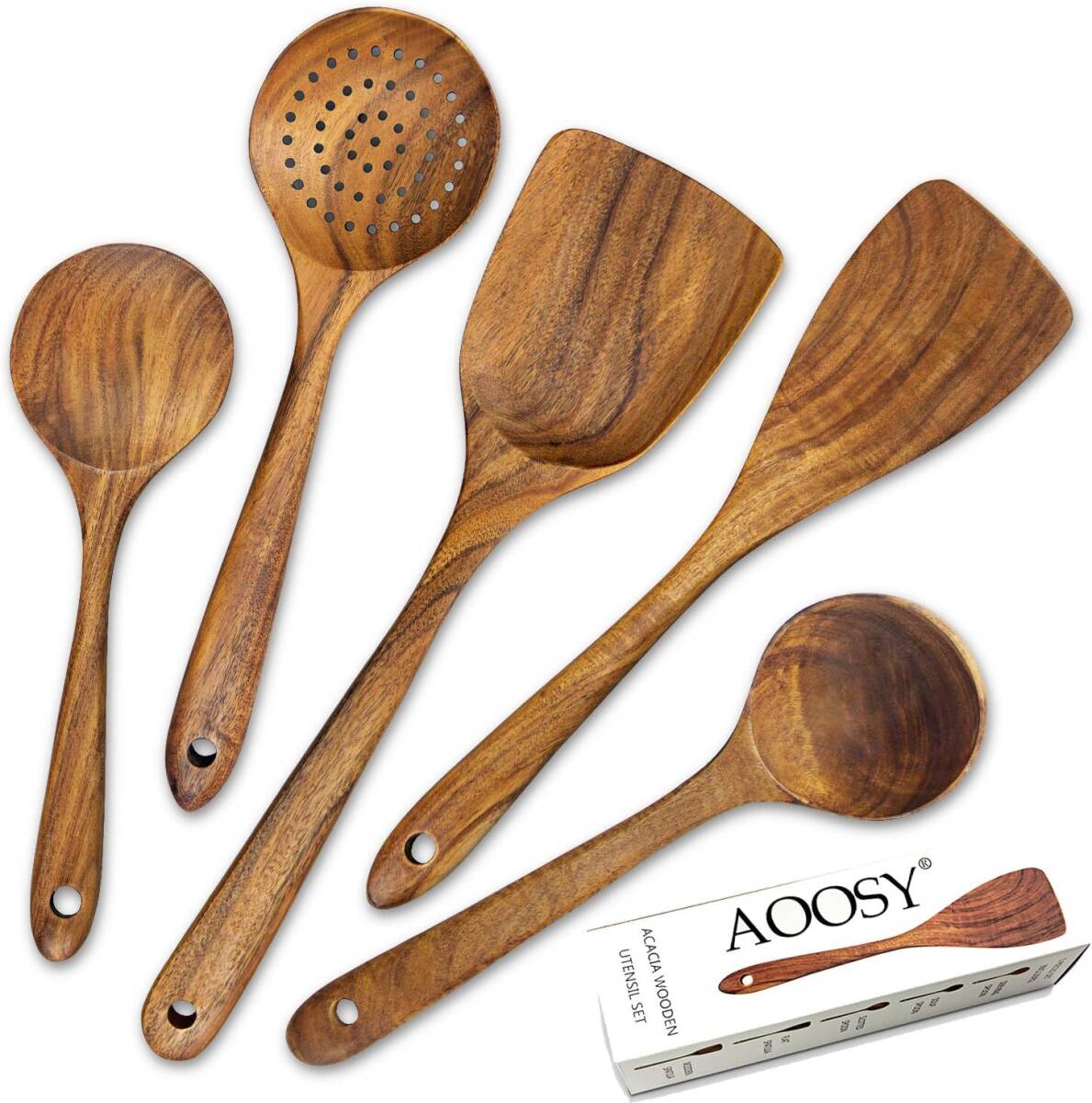 - ファッション 天然アカシア木製 キッチンツール5点セット しゃもじ フライ返し