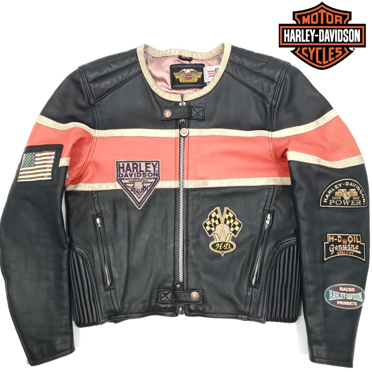 > ワッペン多数◆HARLEY-DAVIDSON◆L本革レザーライダースジャケット黒シングル本皮ハーレーダビッドソン立ち襟ライディング牛革ジャン 933