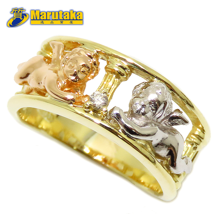 > 天使 透かし柄 イエローゴールド プラチナ ピンクゴールド リング 9号 5.5g ダイヤモンド 0.02ct 18金 逸品質屋 丸高 尼崎市