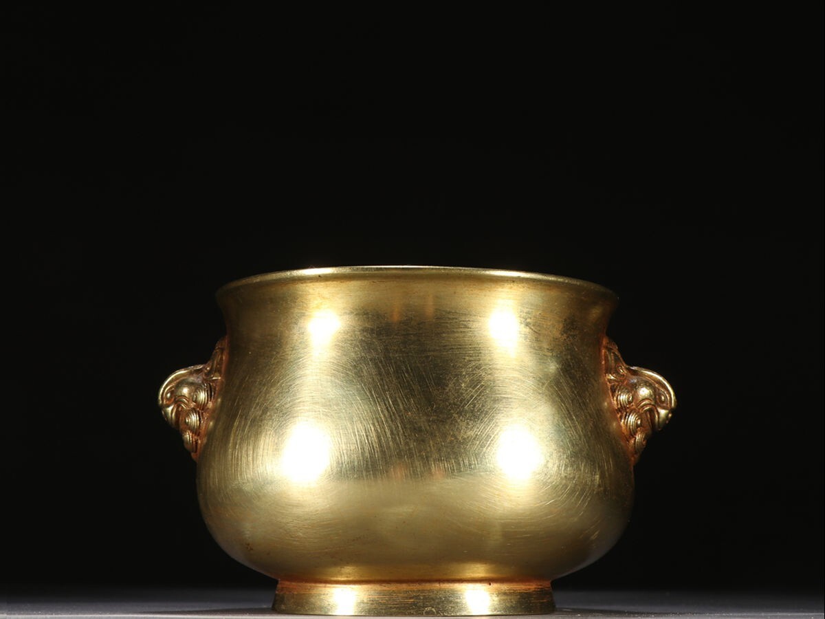 - 「明代 大明宣徳年製 古銅彫 塗金天鶏耳老銅香炉」旧銅器 置物擺件 賞物 中国古美術 旧蔵出