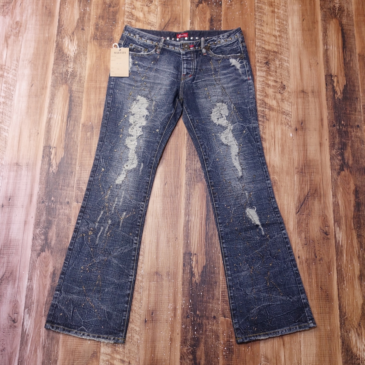 > 未使用 マラキア MARAXIA スタッズ ダメージ加工 フレアデニムパンツ レディース ブーツカット Y2K 美脚 31インチ インディゴブルー OV5