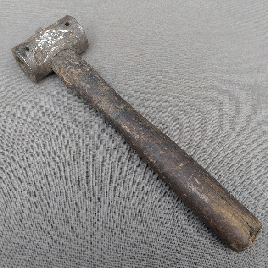 - 特殊玄能 両口丸打面 穴付き 圧入用 金槌 鍛冶道具 ハンマー 古道具 頭約54㎜ 打面約30㎜ 穴約15㎜ 全長約223㎜ 重量約270g 【4579】