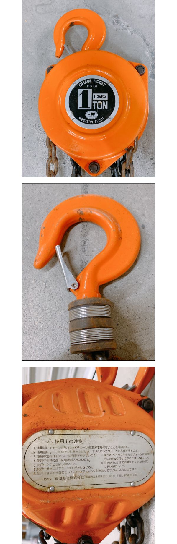 > 中古 藤原産業 チェーンブロック CM型 1TON HS-C1 WESTERN SPIRIT 玉掛け 吊り 運搬 荷揚げ 作業 工具 引取歓迎 茨城 0917か4 E2 100