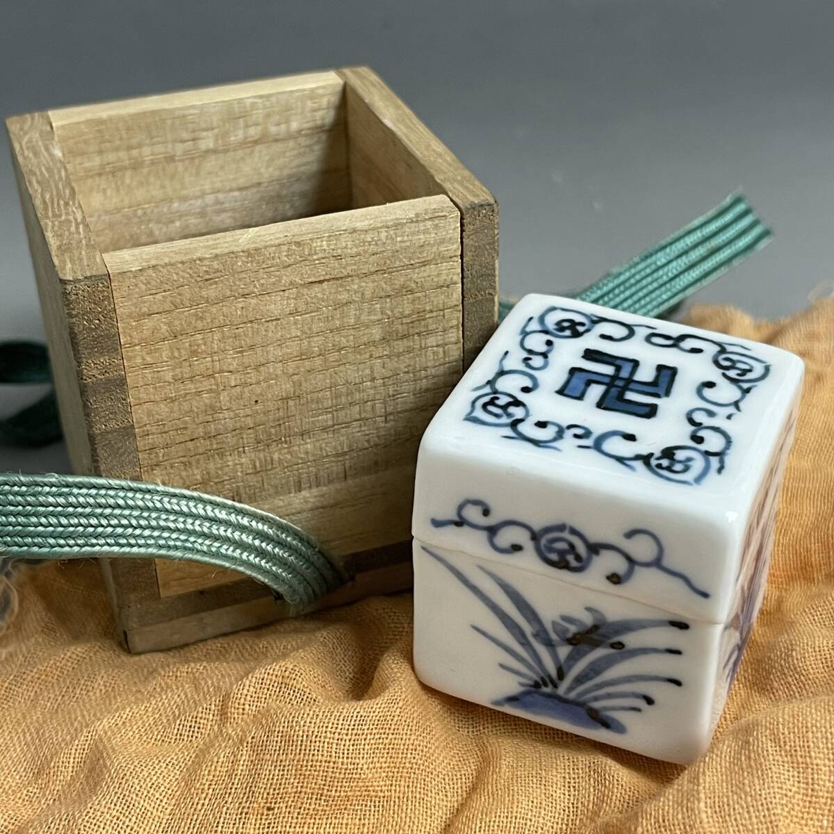 - UNY42/45【旧家蔵出し】中国古玩 唐物 染付 新渡 青花 卍花文 香合 古美術品 木箱 四方 中国美術 古染 煎茶道具※木箱蓋なし◎
