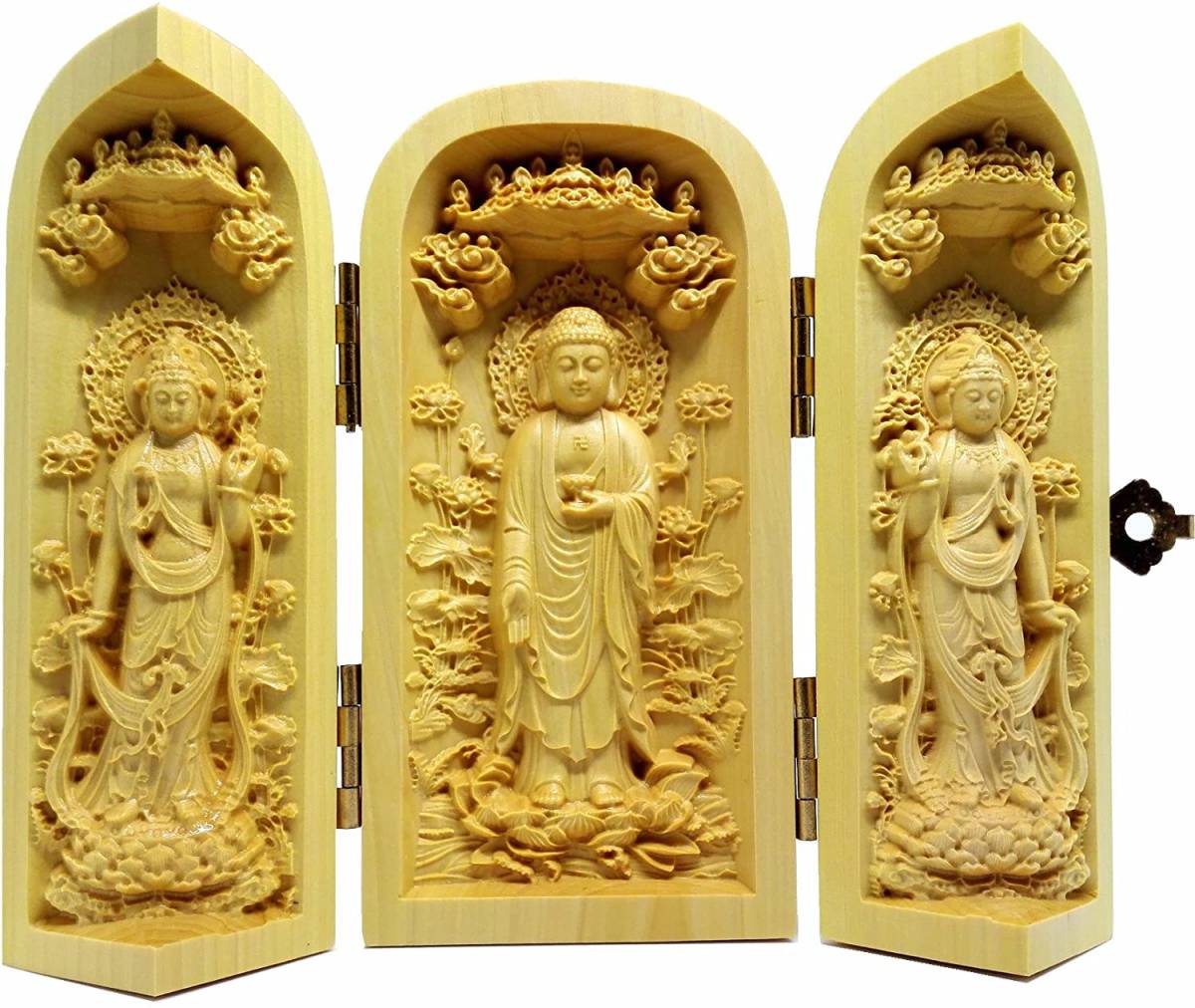 - 【新品】 阿弥陀三尊立像 天然木製(柘植ツゲ) 約10cm 阿弥陀如来 観音菩薩 勢至菩薩 木彫仏像 彫刻 三開仏