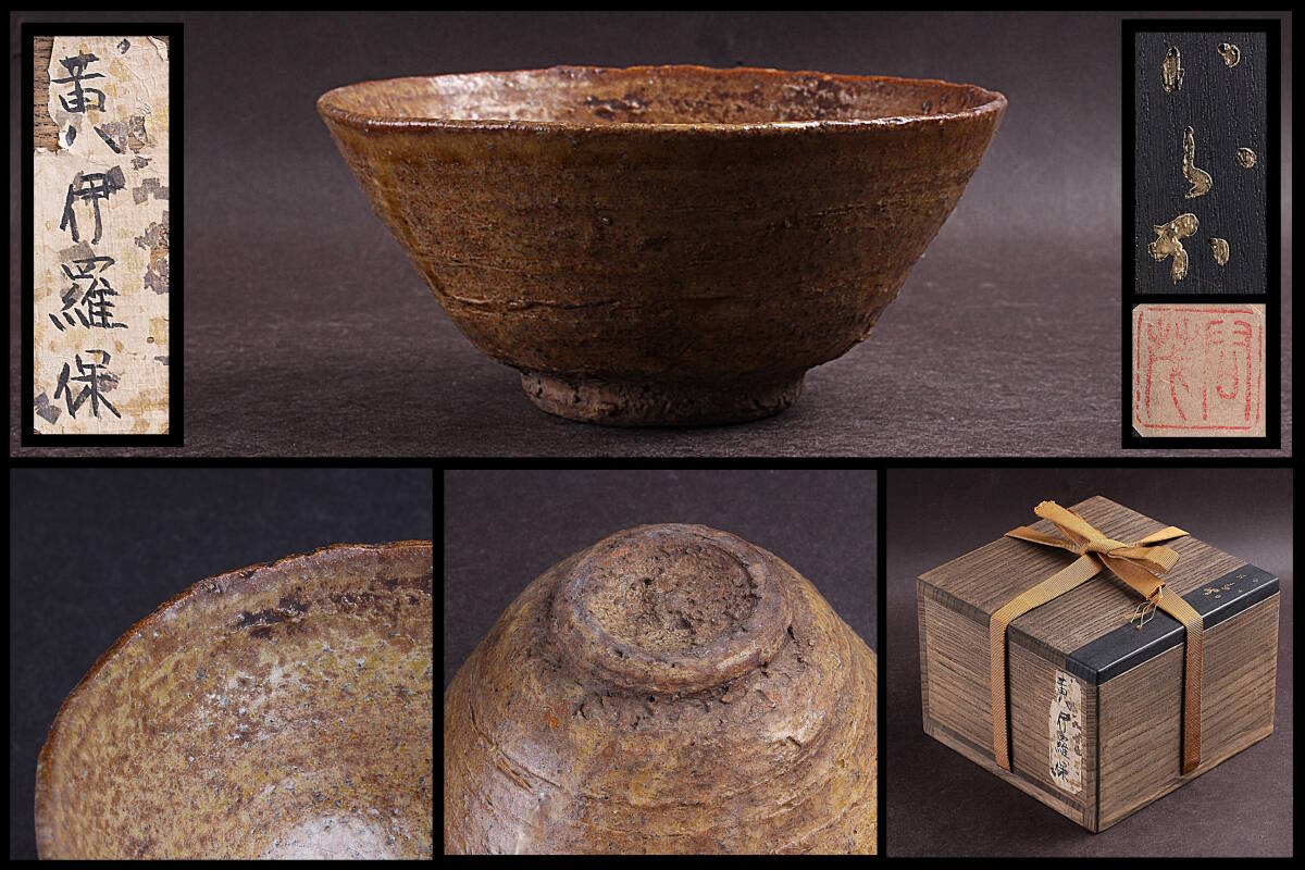 > 【隆庵】時代 黄伊羅保 茶碗 高麗茶碗 名品 金蒔絵文字・時代箱・旧蔵札 古美術・茶道具 本物保証品