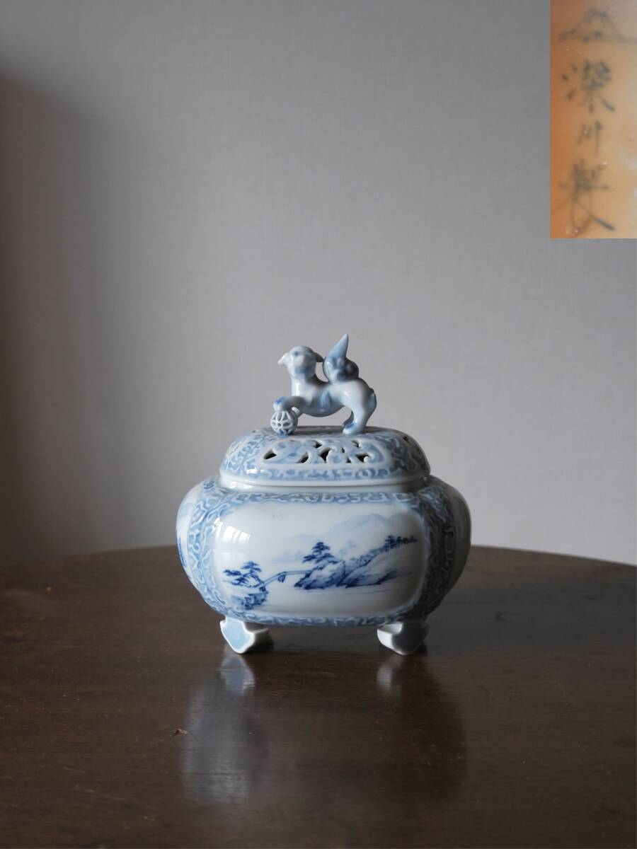 - 【青枠】深川製磁 歴代最高峰作品 山口昇然 画 玉獅子摘 染付陽刻唐草透山水風景画香炉 宮内庁御用達 古道具 時代物 美術品Q1936