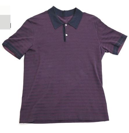 > LOUIS VUITTON オシャレな 左腕にさりげなく「LV」ロゴ・ポロシャツ メンズ M きれいな紫ボーダーx濃紺襟 used \12800