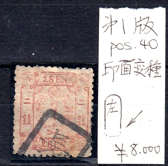 - 手彫切手 和紙仮名なし2銭赤 印面変種 使用済み