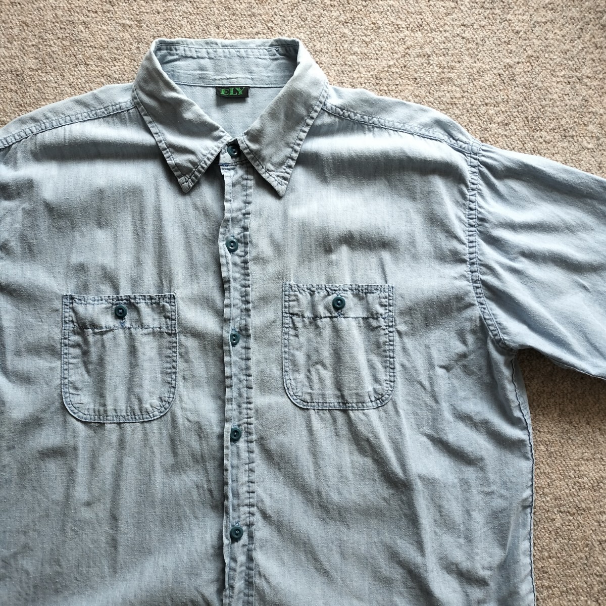 - サイズ◎ 70sELY シャンブレー 半袖 シャツ ダブルステッチ ネップ ワーク ビンテージ 検 50s 60s USA製 BIG MAC USN US NAVY ARMY