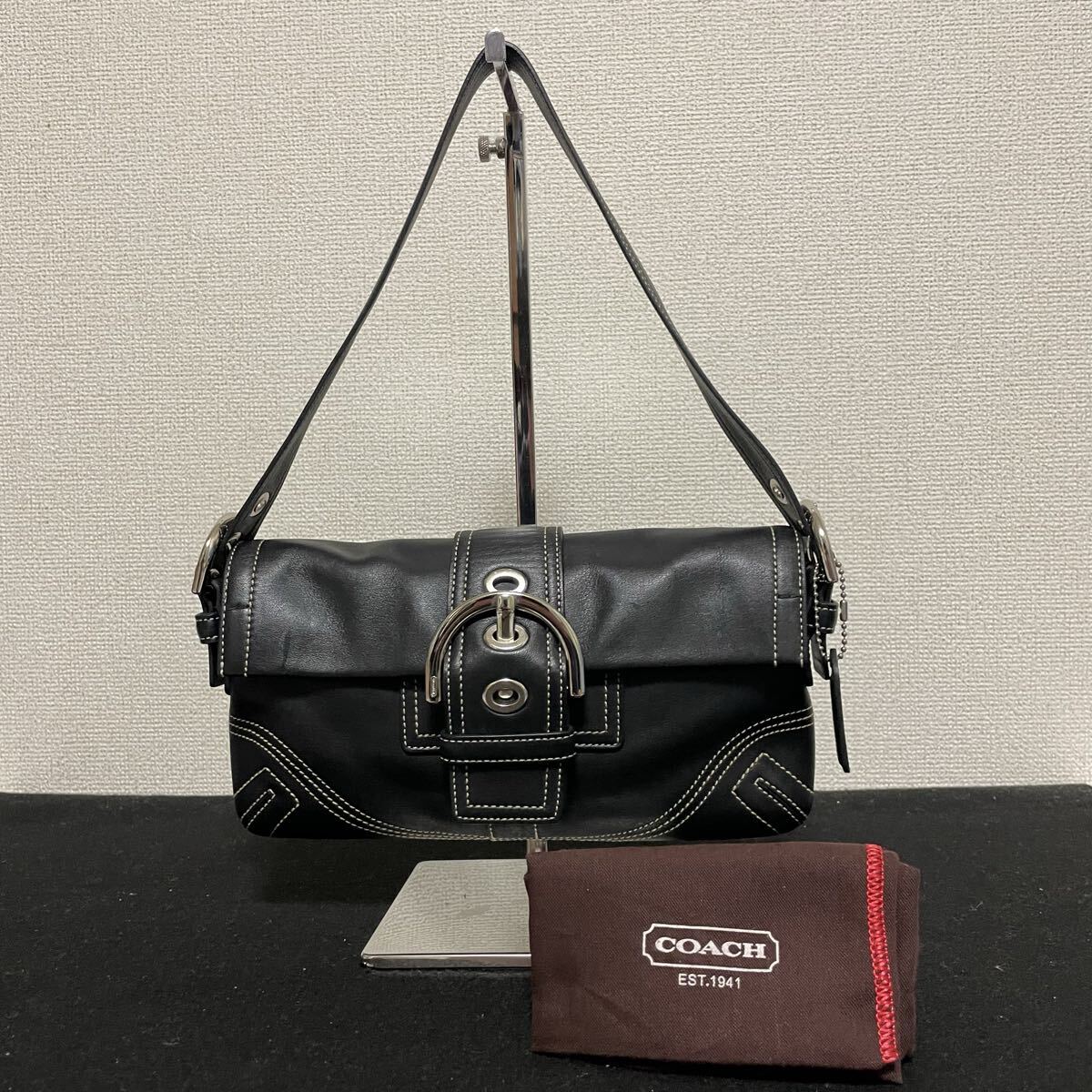 > 1円スタート! 未使用級 COACH コーチ レザー ワンショルダーバッグ 肩掛け ブラック ショルダーバッグ 黒 レディース フラップ 保存袋付き