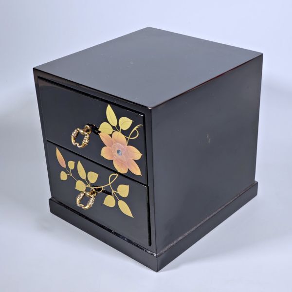 - 会津塗 純金 伝統 手描蒔絵 鉄仙柄 金粉蒔絵 鈴武工房謹製 黒 2段 二ツ引きタンス 小箪笥 小物入れ アクセサリーケース 卓上箪笥