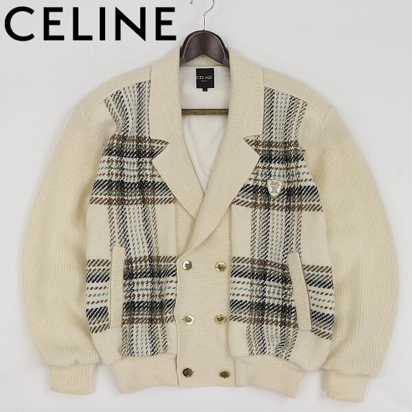 > 【HA426】ヴィンテージ◆CELINE セリーヌ モヘヤ ラメ混 チェック柄 エンブレムワッペン 金釦 ニット ダブル ジャケット アイボリー 48