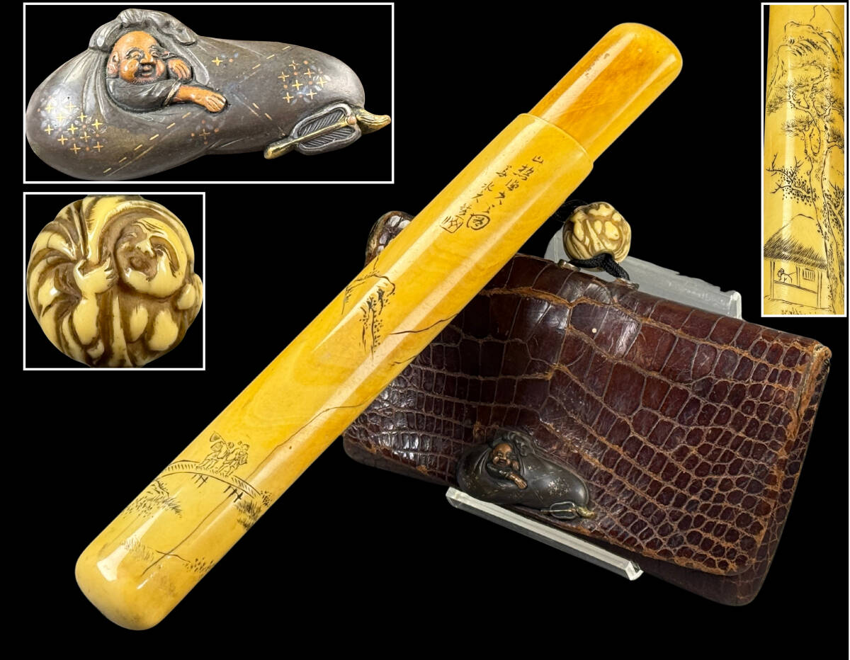 > 【偲】パイプ入 ホルダー 鯨歯風 天然素材重約68g 面図 煙草入れ 細密彫刻 布袋様緒締 留め具 根付 提物 喫煙具収納 喫煙グッズ t-96