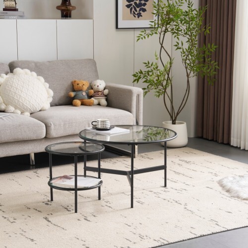 - ネストテーブル 2点セット センターテーブル 丸型 ガラステーブル ガラス天板 クリア おしゃれ 収納付き 直径70/40cm 【ブラック】