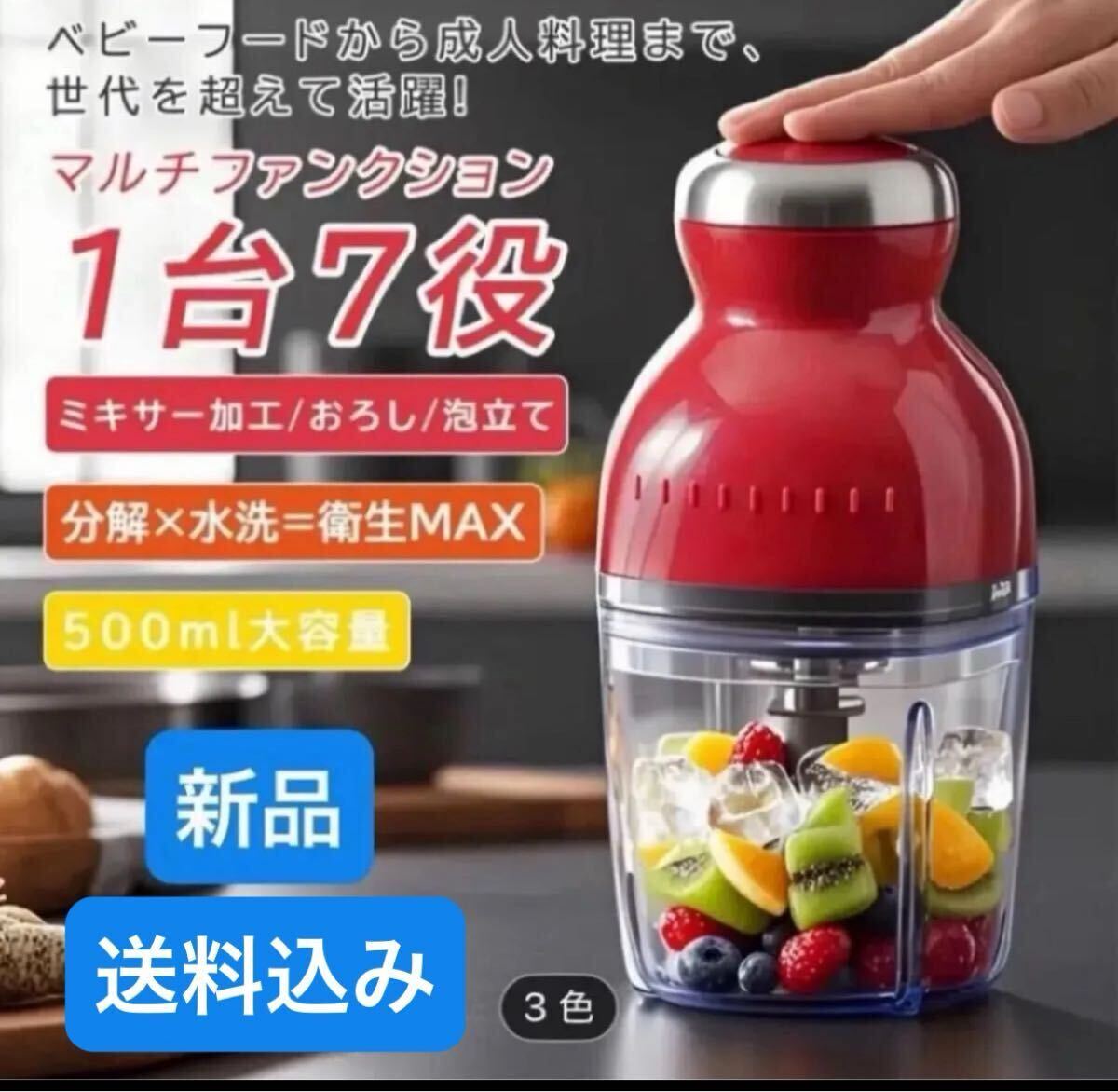 > フードプロセッサー 電動 小型 ブレンダー ミキサー 氷も砕く おろし器 ホイップ 離乳食 みじん切り 500ml 赤 新品