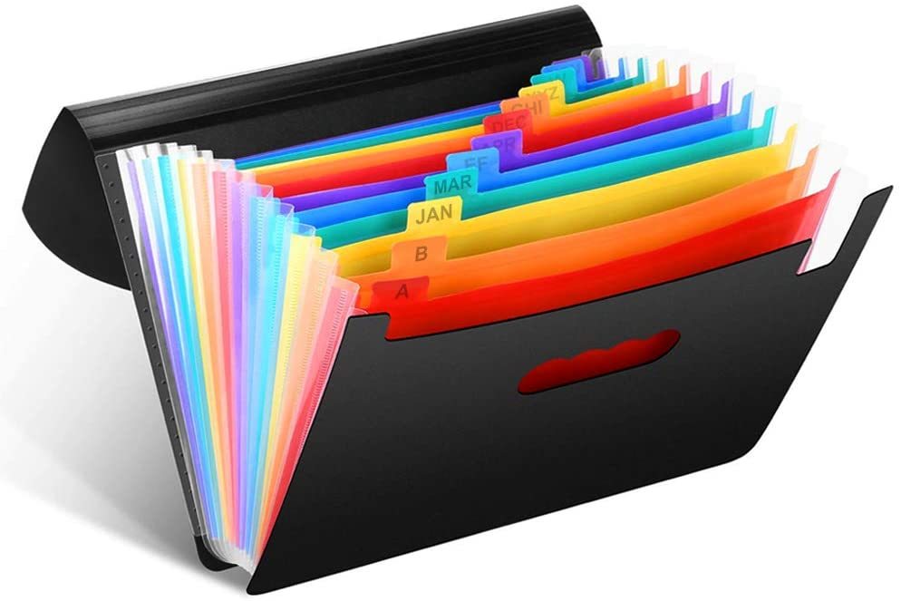 - ファイルボックス A4 12分類 アコーディオン式 書類収納ケース 拡張フォルダ 大容量 蓋付き ラベル付き ブラック