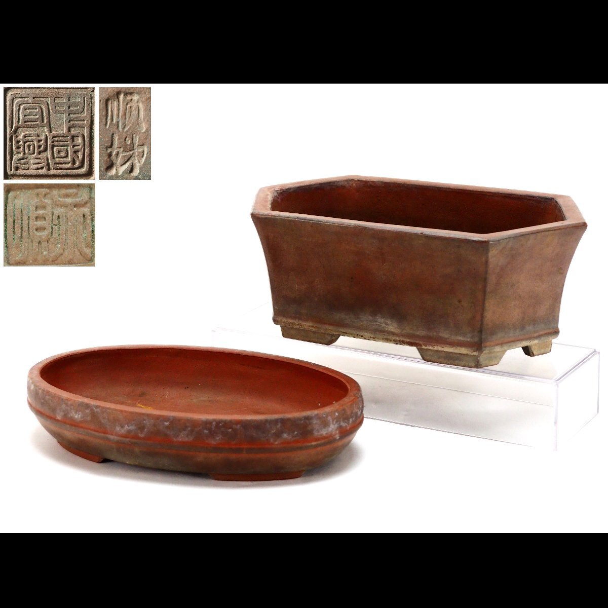 > 【治】『中国宜興』款 中国古盆器 朱泥鉢二点まとめて☆幅 20.5cm~22.4cm (検索:古作 盆景 鉢 盆栽 盆栽鉢 植木鉢 紫砂 唐物 ) JOG04