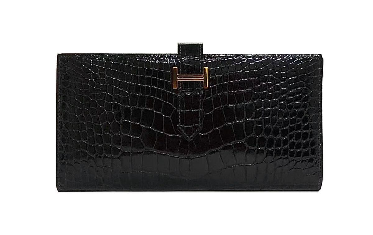 > 未使用☆エルメス HERMES ベアンスフレ クロコ アリゲーター クロコダイル ブラック ノワール 黒 ゴールド金具 長財布 マチあり