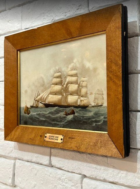 ヴィンテージの1970年代イングランドウェッジウッド磁器「ハリケーン」クリッパー船塗装プラークウッドフレームです。