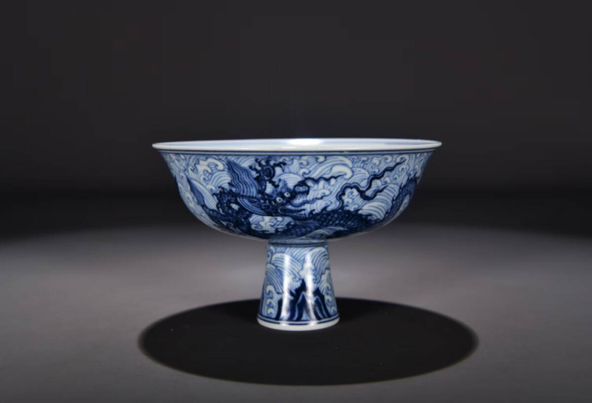 - 磁器 大明宣德年製 青花 海水龍紋 高足碗 古陶瓷 古擺件 古置物 中国古玩 骨董品 時代物 稀少唐物