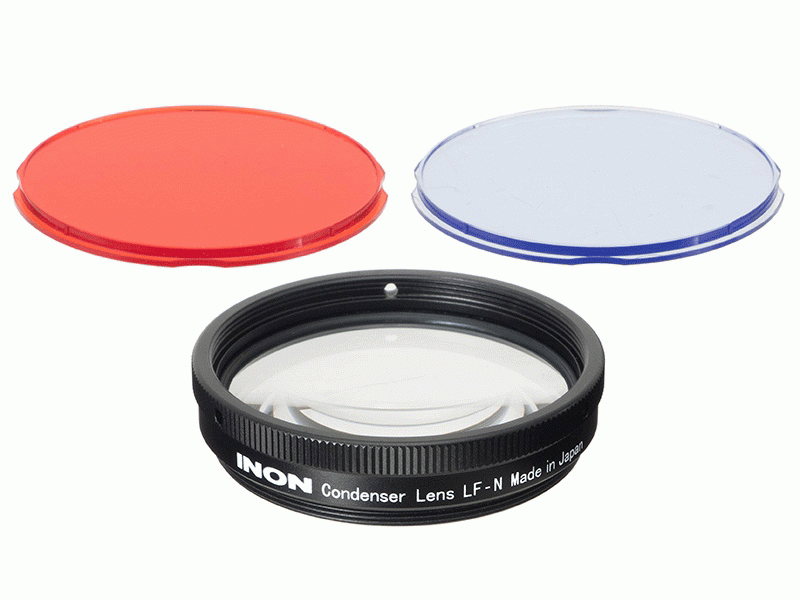 「LF800-N」に装着することで、ライトの照射光を集光させることができます。スポット照射可能な最短距離を縮め、照射スポット径を小さくします。ピンスポットライトで演出した撮影など、全く新しい水中撮影の可能性を広げます。また、中心輝度が大幅に向上するため、定常光での超マクロ撮影などにも活用できます。 レンズ前面の内側にジョイント用のネジが備わっており、集光レンズ・LF-Nを2枚重ねにすることで、スポット照射可能な最短距離をさらに縮め、照射スポット径を小さくすることができます。 集光レンズ・LF-Nには、「カラーフィルター・LF-Nセット」と同じ、「赤フィルター・LF-N」と「青フィルター・LF-N」が同梱されており、レンズの後端にフィルターをはめ込むことができます。