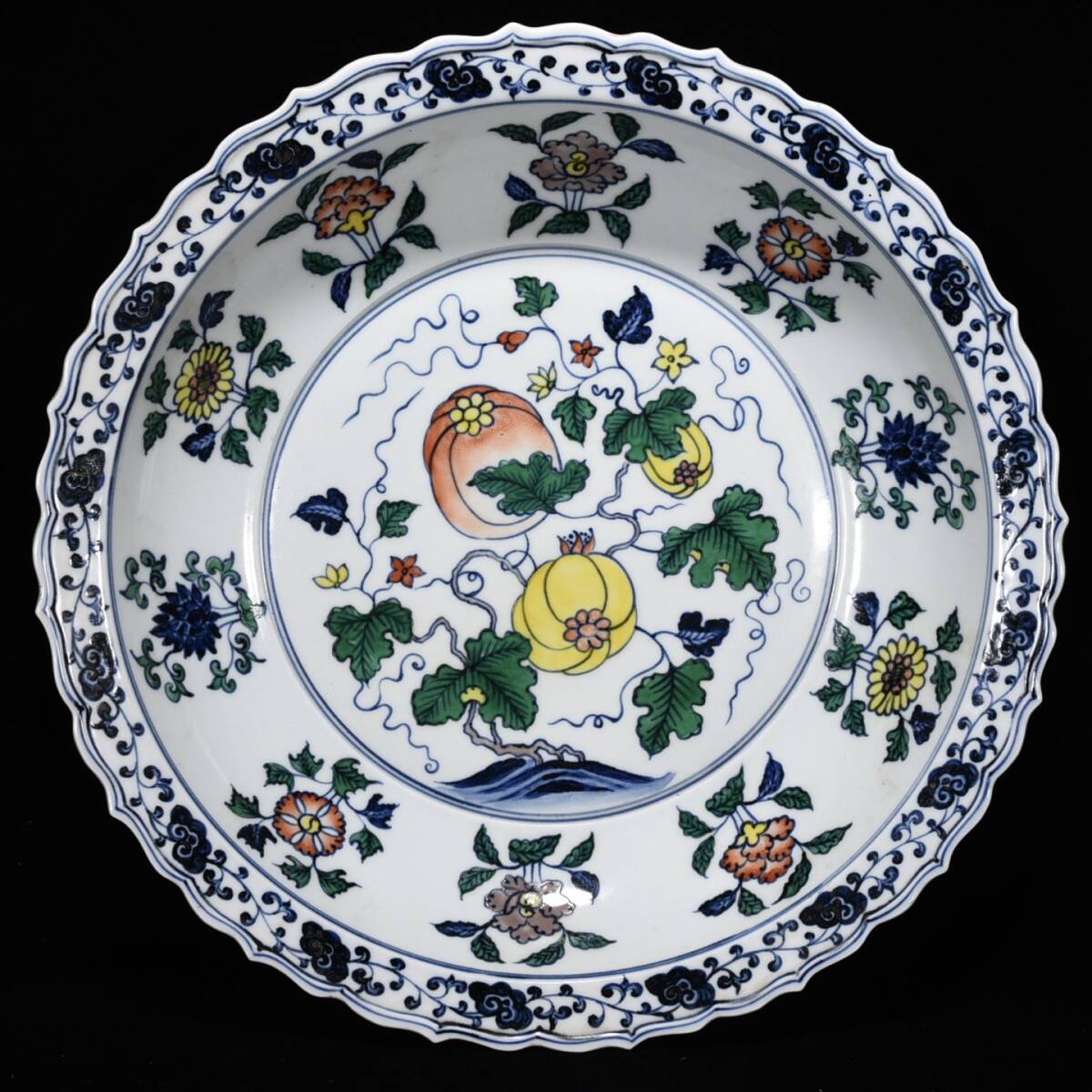 > ◆珍蔵◆中国古美術 大明宣徳年製款 斗彩 古陶磁 多子多福紋花口大盤 精品 細密細工造 置物 擺件 骨董品 古賞物
