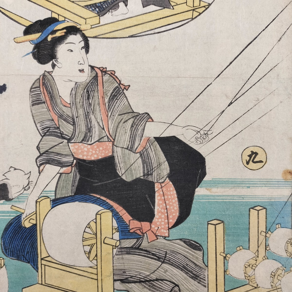 - 子猫!江戸期/真作 歌川芳員「蚕やしなひ草」本物浮世絵木版画 美人画 錦絵 大判