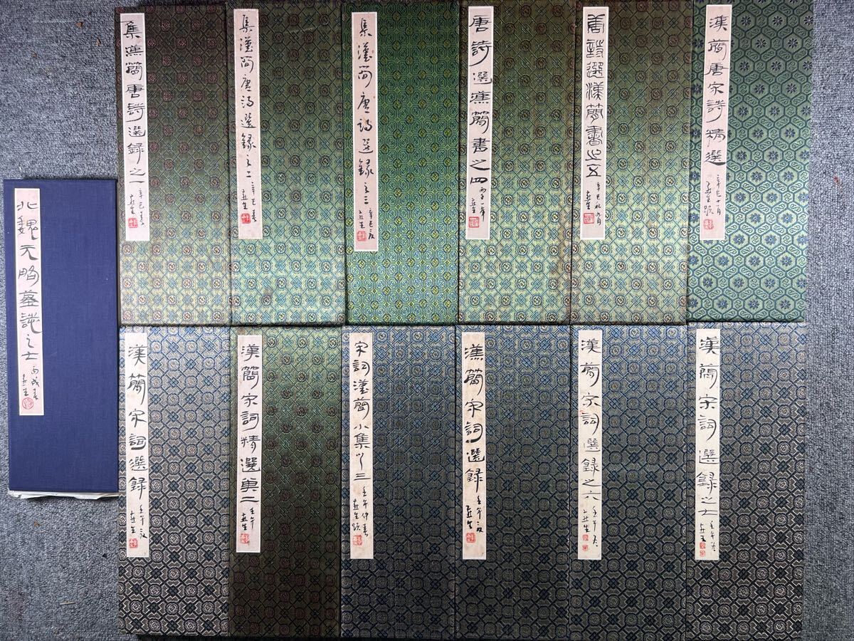 - 李燕生 漢簡唐詩宋詞帖11冊一括、肉筆真作保証、署名落款有、錦表紙折帖、2001年頃作品、書道篆刻家、和本唐本中国
