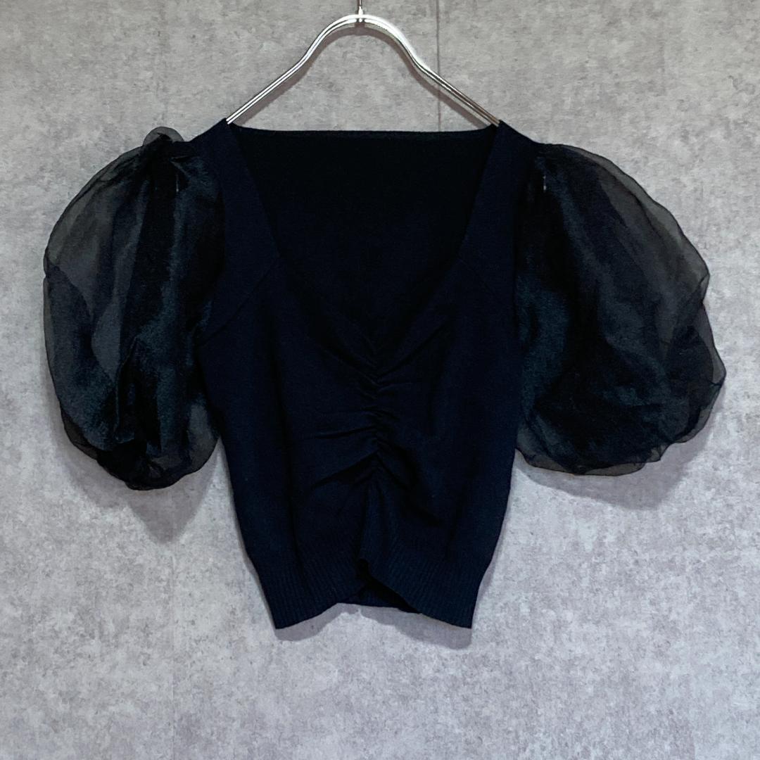 - 【美品】グレイル(M)シアーパフスリーブニット*半袖*フロントギャザー*ブラック