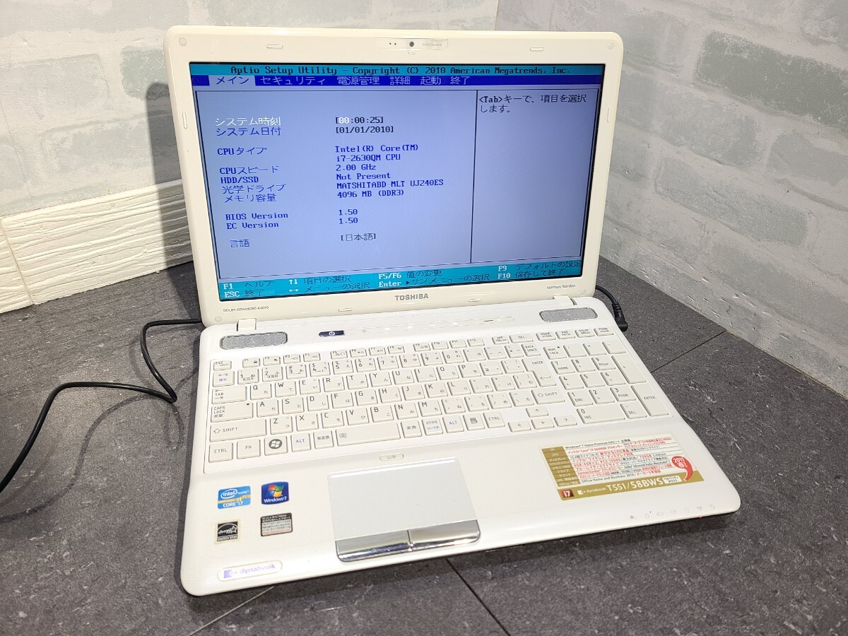 > 【現状品】管2T90 TOSHIBA dynabook T551/58BWS CPU core i7-2630QM Bios起動OK HDD無し、HDDマウント有り、メモリー4GB、バッテリー無し