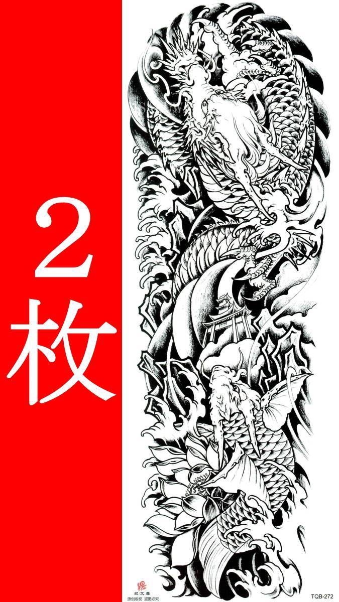 - タトゥーシール 2枚 48X17cm 入墨 タトゥーステッカー 消せる刺青 ボディーアート ハロウィン あおり運転対策 黒 龍 竜 鯉 コイ 蓮の花