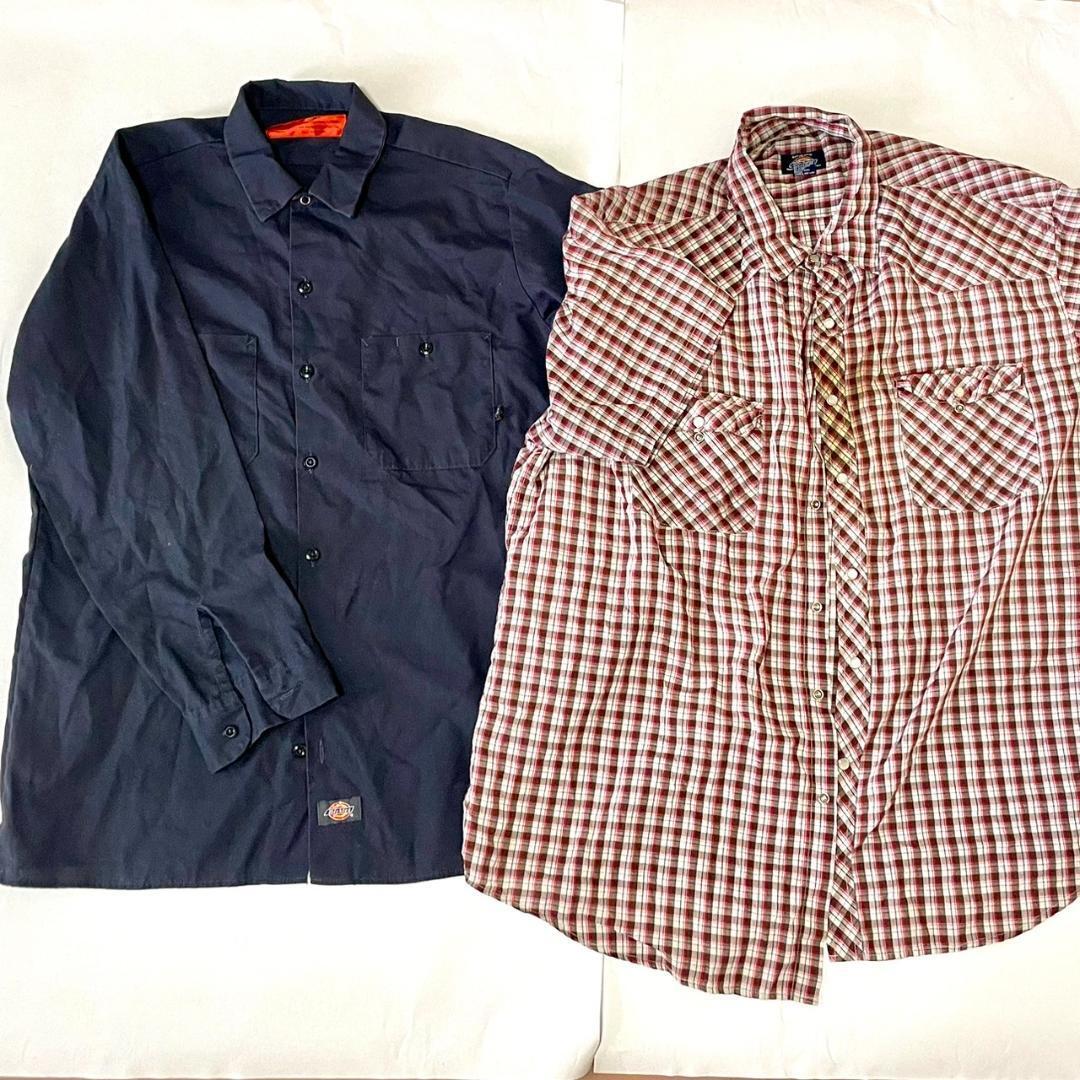 - 古着 2点セット Dickies ディッキーズ 長袖シャツ 紺 + チェックシャツ 赤 白 黒 ウエスタン スナップボタン メンズ M L 春秋向け