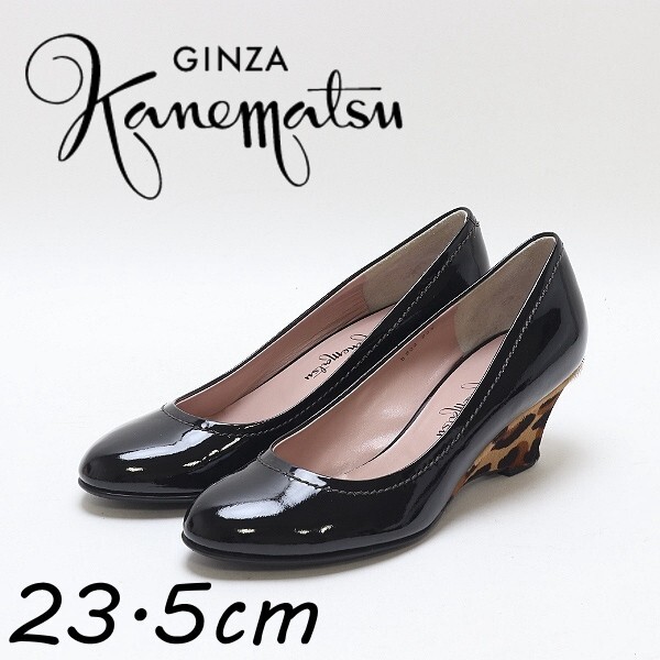 - ◆銀座かねまつ エナメル×ハラコ レオパード柄使い ウェッジソール パンプス 黒 ブラック 23.5cm
