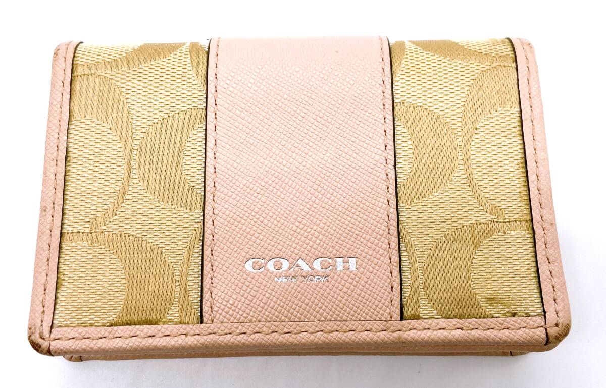 - 【28401】COACH コーチ カードケース 名刺 ベージュ ピンク beige pink ミニ ポーチ 財布 レディース ジャガード レザー 通勤 通学