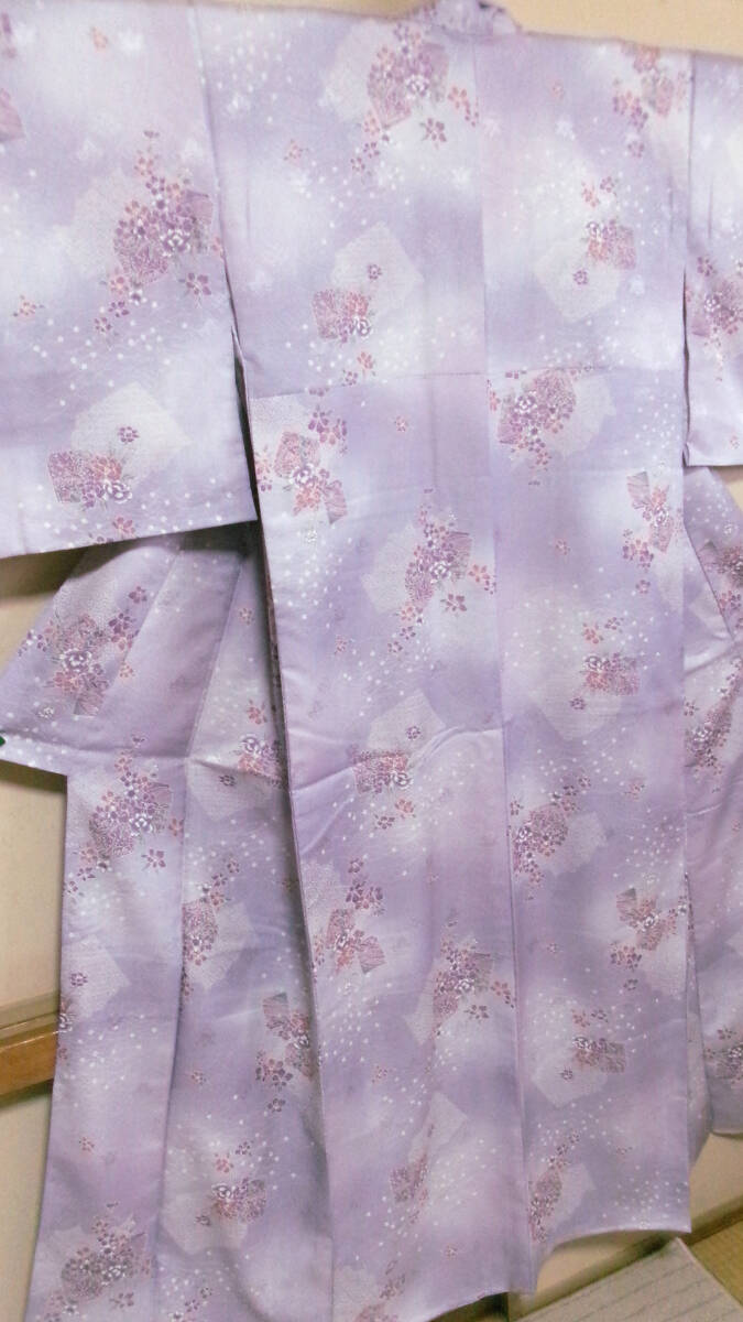 > 102【未使用品】雨の日に※薄紫色華模様※洗える※袷※小紋※着物 丈157 裄65