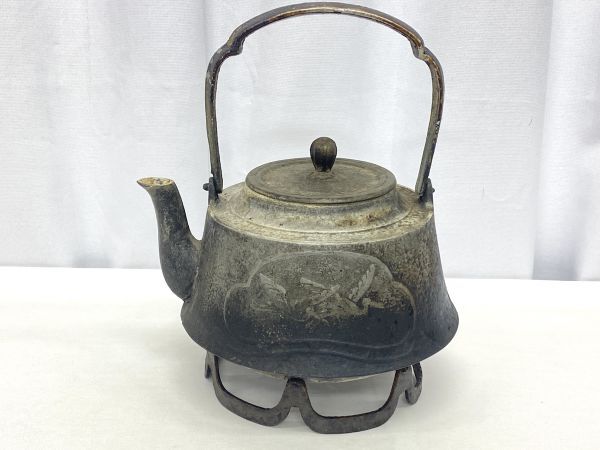 > 【TK086】大型 アルミ瓶 五徳付 鳥紋 直径約22cm 高さ約17cm 茶器 茶道具 湯沸かし 道具 レトロ